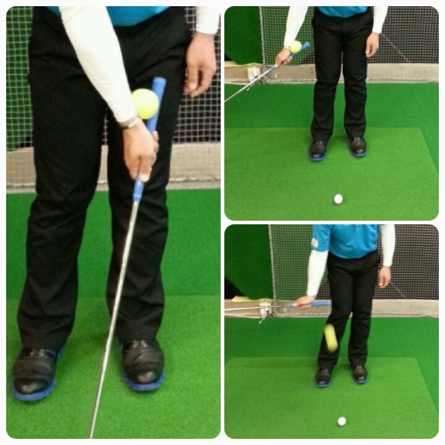 そこで、写真のように右手1本のドリルの形の手首のところにボールを挟んで、切り返しの瞬間にボールが落ちるようにします。