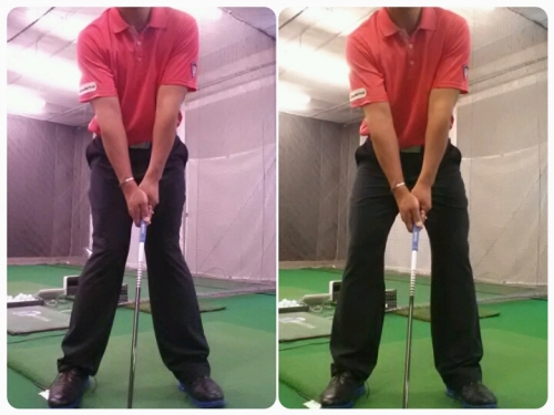左の写真のようにすると、テークバックで左膝が右に動いた反動で右腰が右へ流れたりします。俗に言う「スエー」です。